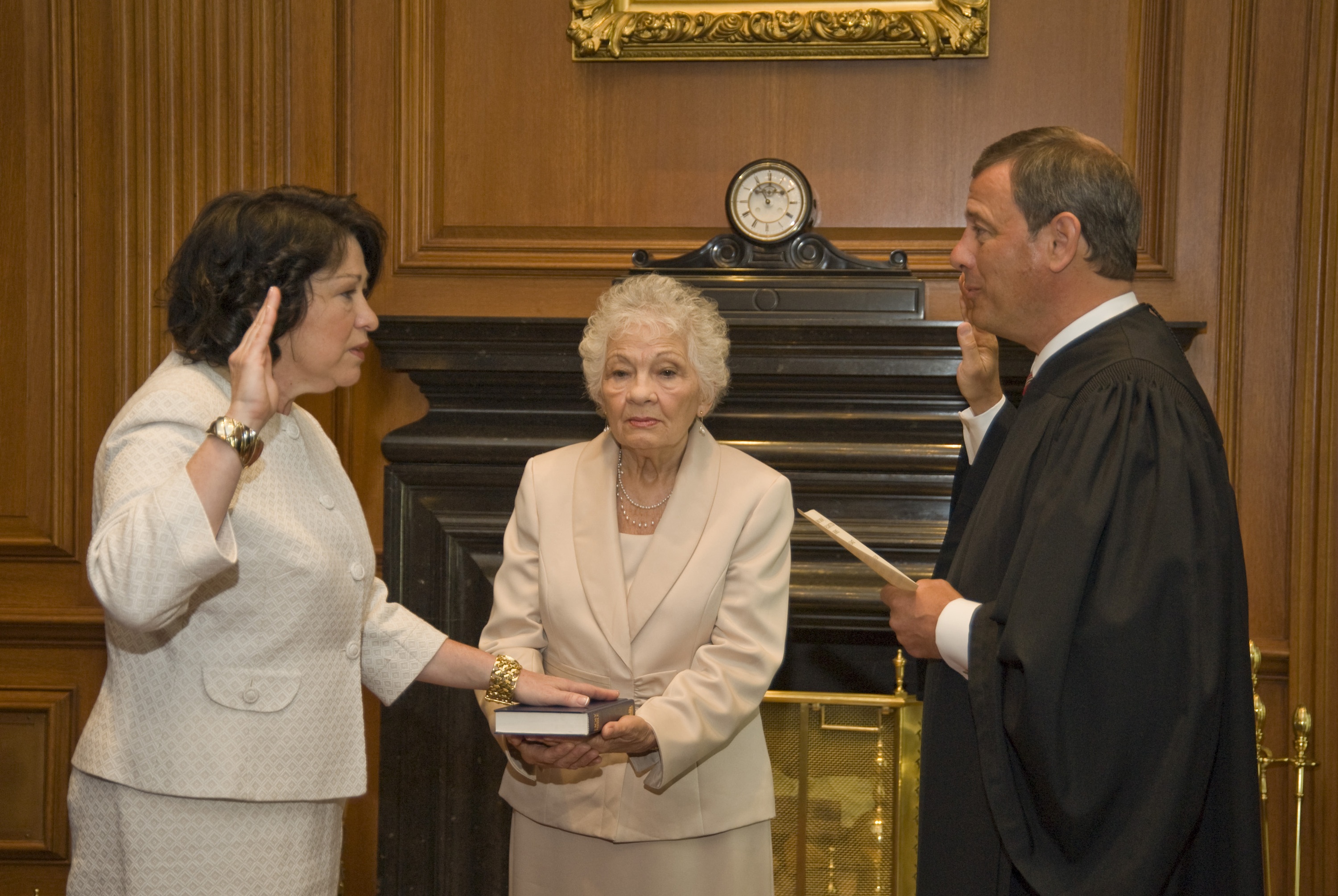 Chief Justice John G. Roberts, Jr., administered the Constitutional Oath to Judge Sonia Sotomayor in a private ceremony in the Justices’ Conference Room on Saturday August 8, 2009. Mrs. Celina Sotomayor, the mother of the new Associate Justice, held the family Bible during the ceremony. Justice Anthony M. Kennedy was the only other member of the court in attendance.