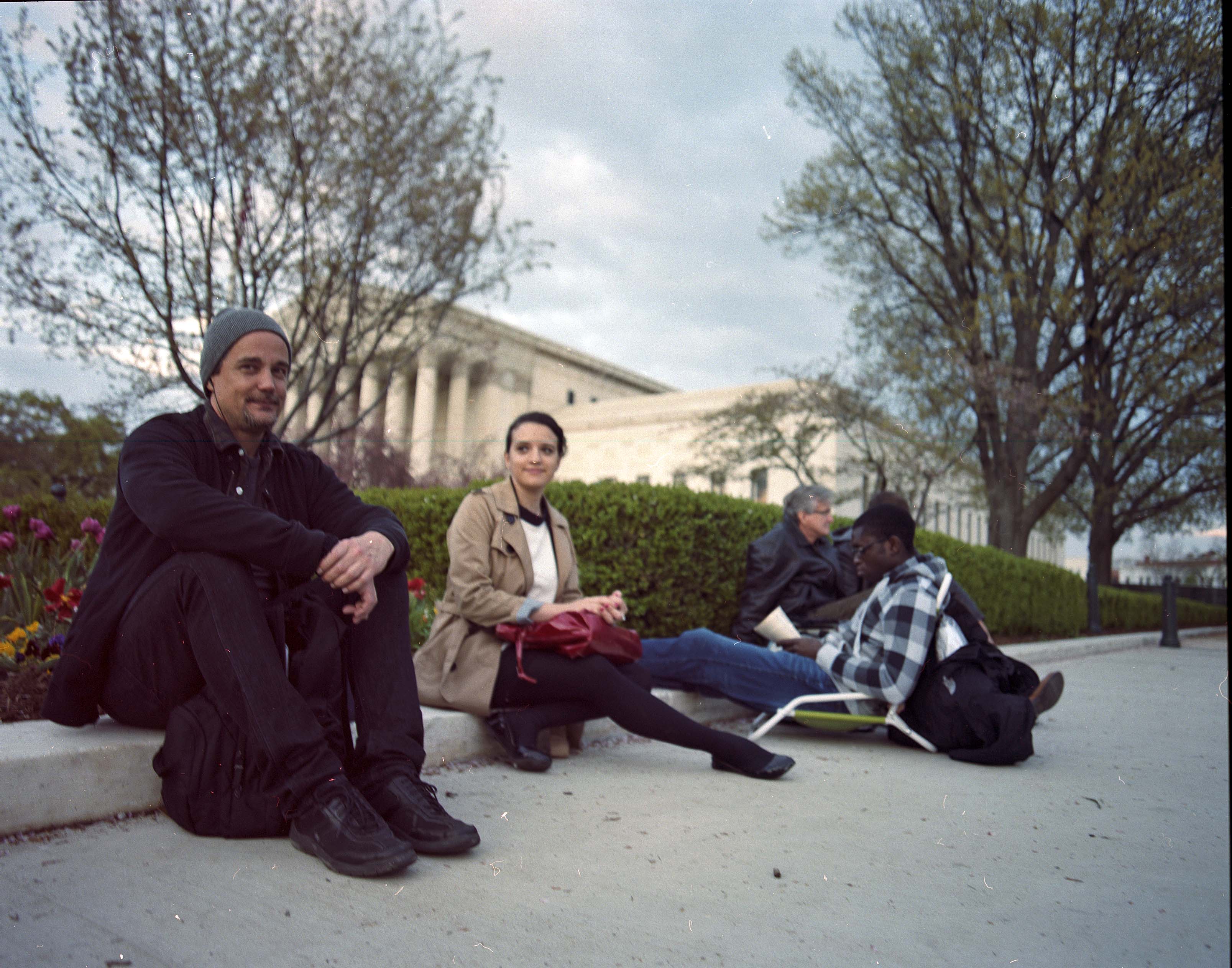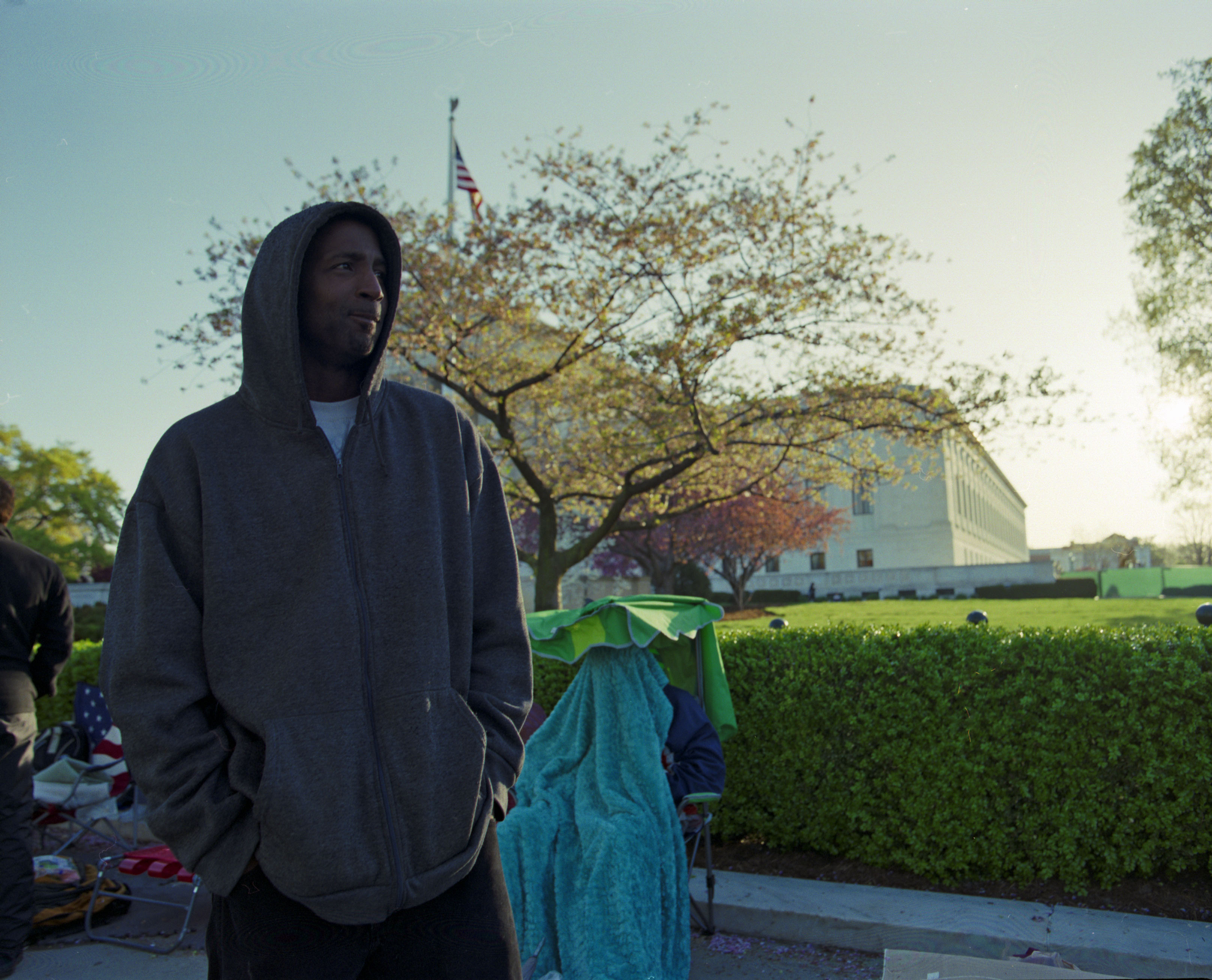 Kathie, a lawyer from Atlanta and the first person in the public line on Friday who was not a professional line stander, told me that she considered joining the Supreme Court bar to avoid the public line, but – because she thought it was unfair that bar members got their own line – ultimately decided to wait out in the cold and rain the way everyone else did. This was no small commitment considering that temperatures dipped down into the mid-thirties two nights in a row during her four-day wait. Where is the closest bathroom, you wonder? The Union Station Starbucks was the most popular one, but it closes at nine o’clock each night. The man pictured in the hammock next to her, Danny, was one of many professional line standers. When he isn’t standing in line, Danny is unemployed, so he was grateful to have the work outside the Court.