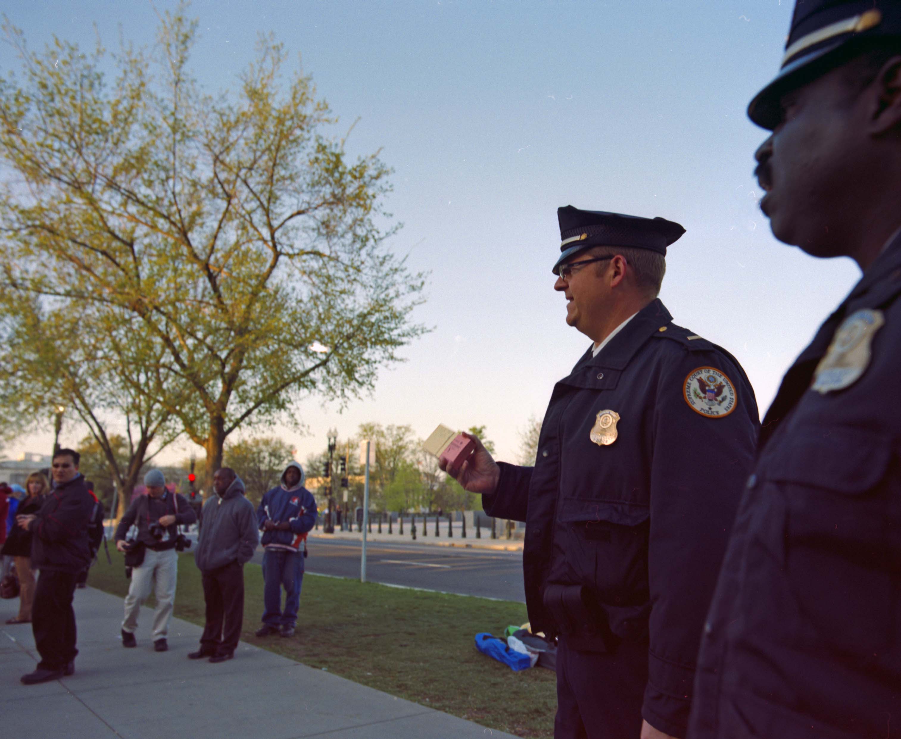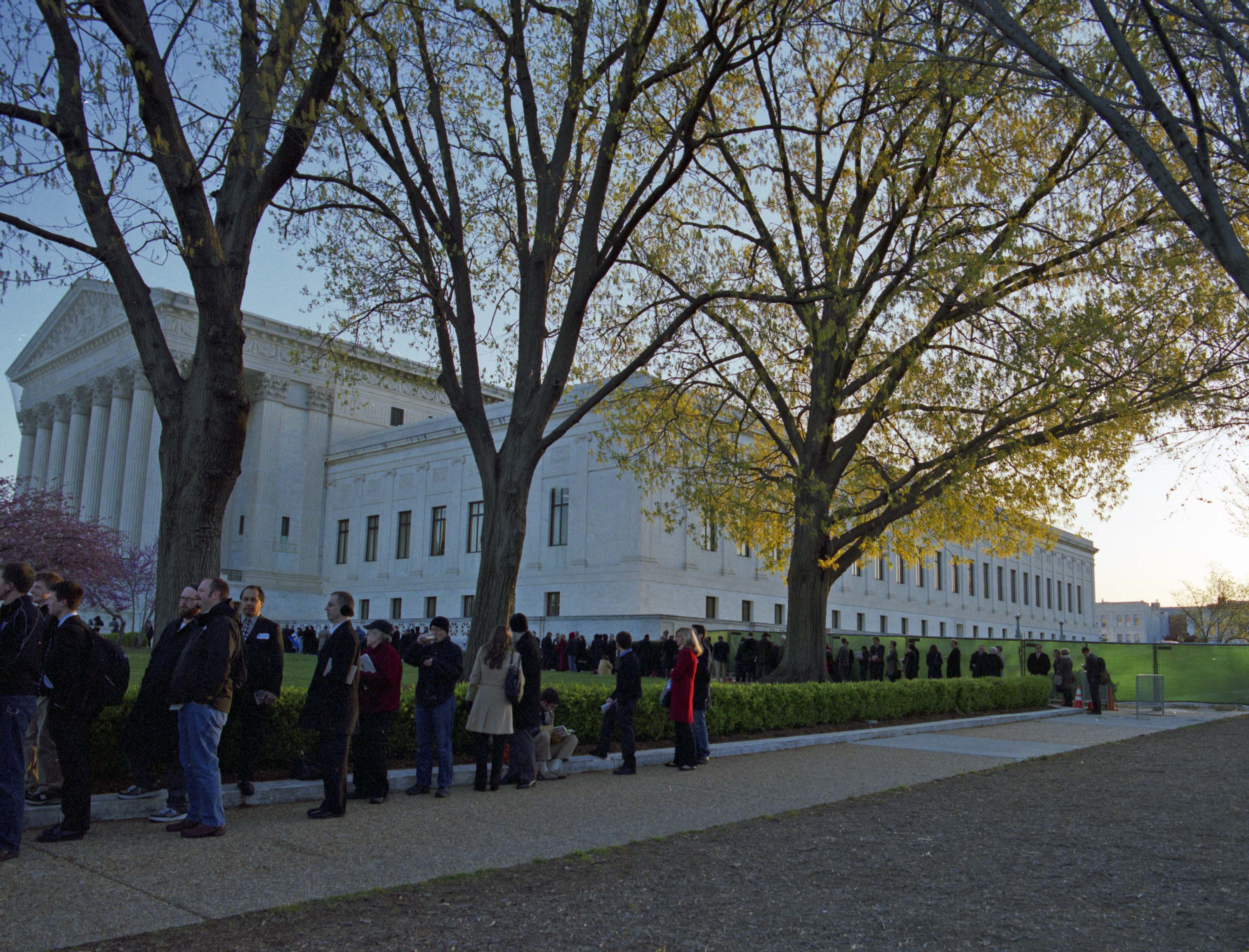 There were sixty closely guarded public tickets to each argument. [Correction 4/11 Daniel Rice, a Duke student who blogged about his experience waiting in the line, notes that there were actually 120 tickets for Monday’s argument.]