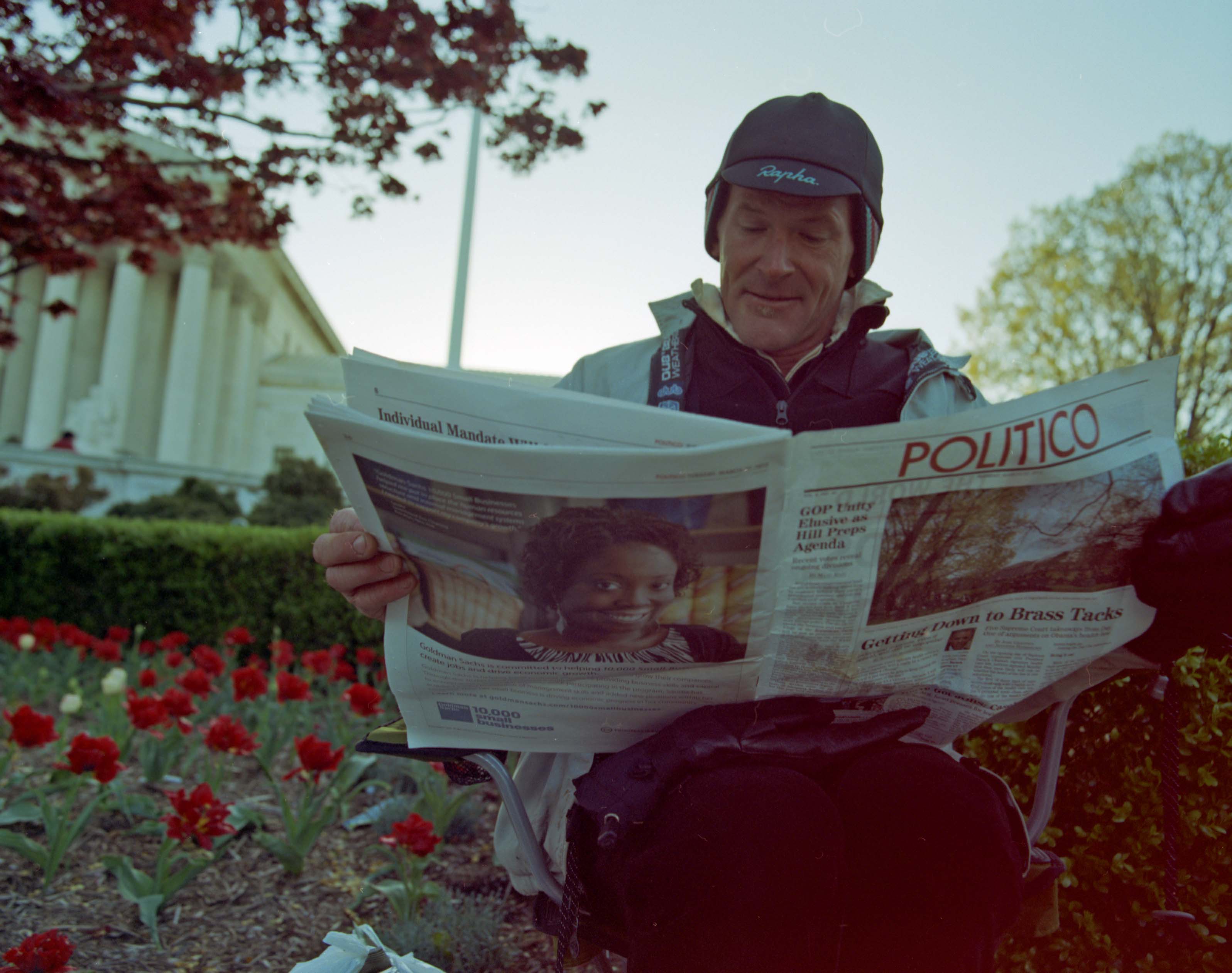 Kevin, one of the paid line standers, remained outside the Court reading about the mandate as others went inside to attend the argument.