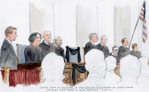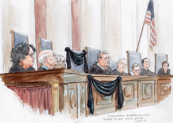 “The memorial drapery on the Bench and chair beside me signifies mourning for a Justice who has died in active service on the Court,” Chief Justice John G. Roberts, Jr., said as he and his seven remaining colleagues took to that bench. “Today, it marks the loss of our friend and colleague, Antonin Scalia, who died unexpectedly on February 13, 2016.”