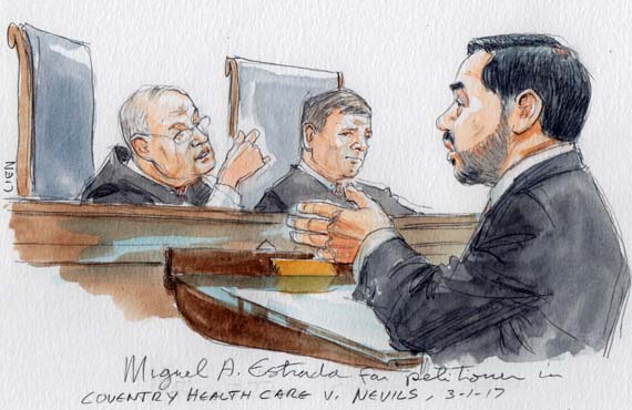 Perhaps the most telling feature of the argument was the lack of pointed questioning during Miguel Estrada’s argument on behalf of the insurer, Coventry Health Care. The bulk of Estrada’s argument was consumed by comments exploring the boundaries of a potential ruling in his favor. For example, Justice Anthony Kennedy, after commenting that “you have an express-preemption provision [and] a Federal entity that makes the contract[, which] may be all you need … in order to prevail,” asked if “some limiting principles … should just be in the back of our mind when we think about preemption.” And again, after suggesting apologetically that “it’s not really your obligation to … address a parade of horribles that isn’t in this case,” Kennedy asked if Estrada could offer any “general limiting principles [for] determining whether or not preemption … is permitted.”