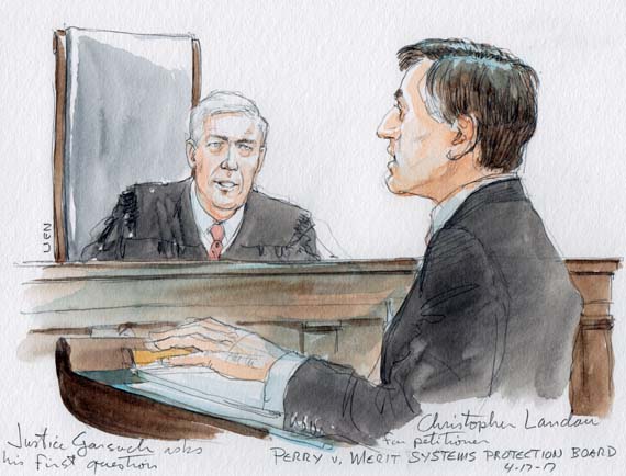 The highlight of the argument was the aggressive questioning by Justice Neil Gorsuch, hearing his first case on his first argument day on the court. In questions for both sides, Gorsuch seemed skeptical of the notion of a mixed case singularly heard in the district court, suggesting that district courts are granted authority only to hear the discrimination portion of the case, but not to review the determinations of the MSPB, which remain within the exclusive purview of the Federal Circuit. To the extent that necessitates splitting claims, the splitting is supported by the statute, which does not provide for district court review of MSPB decisions. When Christopher Landau, arguing for Perry, insisted that district courts already review substantive and procedural decisions of the MSPB and that this case does not require the court to break any new ground, Gorsuch responded that Landau instead was asking the court “just to continue to make it up.” Gorsuch later pushed Assistant to the Solicitor General Brian Fletcher to follow the language of the statute to a simpler approach, even if it means splitting claims. Justice Elena Kagan intervened, arguing that the court’s decision in Kloeckner v. Solis and cases from all courts dating back to 1983 establish that full merits review in mixed cases rests with the district court. To change course, she insisted, “would be kind of revolution, I mean, in — in — to the extent that you can have a revolution in this kind of case.”