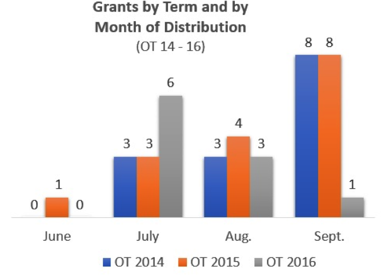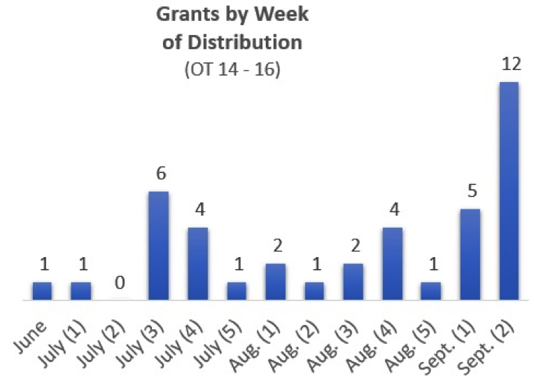 - September is surprisingly heavy. September is a mirror image of June in that only a couple of weeks’ worth of distributions go to the long conference. But those two weeks yield a disproportionate share of long conference grants – 42.5 percent during OT 2014-OT 2016. But note the variability: After two terms of heavy grants from September distributions (eight and eight, respectively, for OT 2014 and OT 2015), there was only one in OT 2016. (There was a reduction in grants from the long conference that year, because the eight-member court was being very picky about grants; perhaps the September downturn was just a part of that general reluctance to grant.)