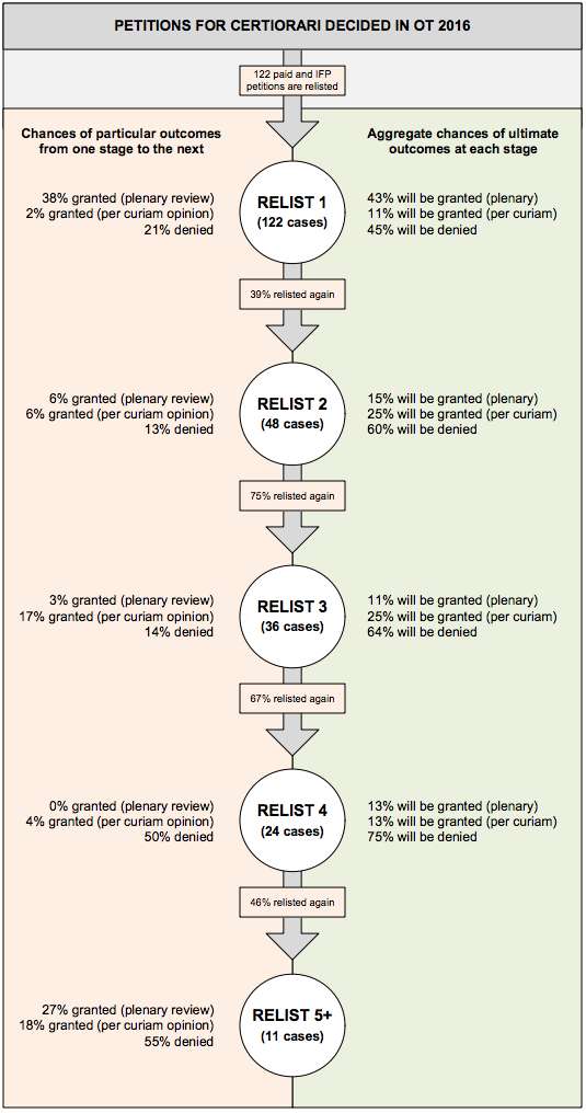 With the new term about to start, we thought it was time to look back and see what lessons we could learn from the relist statistics for October Term 2016. The big picture remains much as it has since the Supreme Court began relisting cases for OT 2014: Relists are an effective prerequisite for most plenary grants, in which a case is scheduled for briefing and oral argument, and still are an excellent predictor of eventual grants. But as we noted last year, the relist story is not static. Relists were less reliable predictors of grants for OT 2016 than for the prior two terms, and the dynamic for multiple relists was quite different this past term than it was during OT 2015.