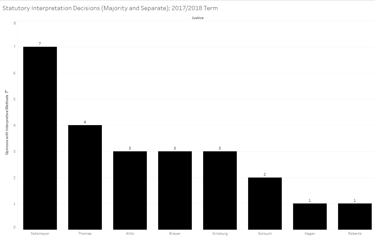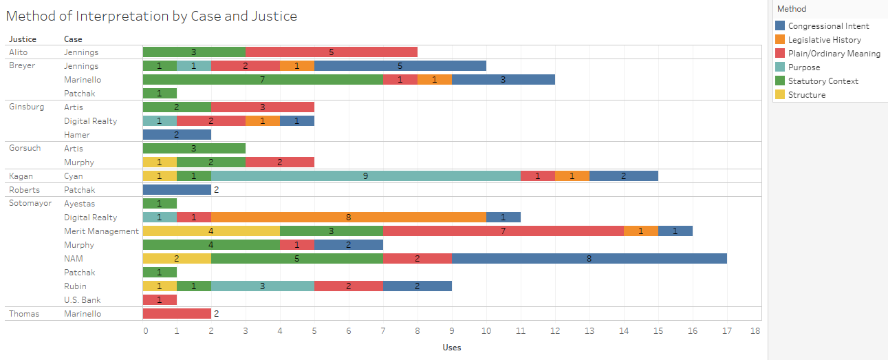 Sotomayor, along with employing these methods of interpretation more often than the other justices so far this term, also used a diverse set of tools to interpret the statutes at issue in the cases. The following chart breaks down the uses by case and justice.