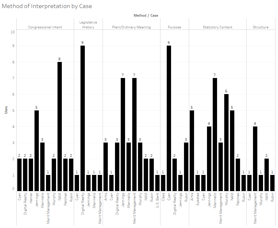 To highlight some of the cases and methods: Congressional intent was mentioned most frequently in Murphy v. Smith, legislative history in Digital Realty, plain meaning in Jennings and Merit Management, legislative purpose in Cyan, statutory context in Marinello, and a statute’s structure in Merit Management.
