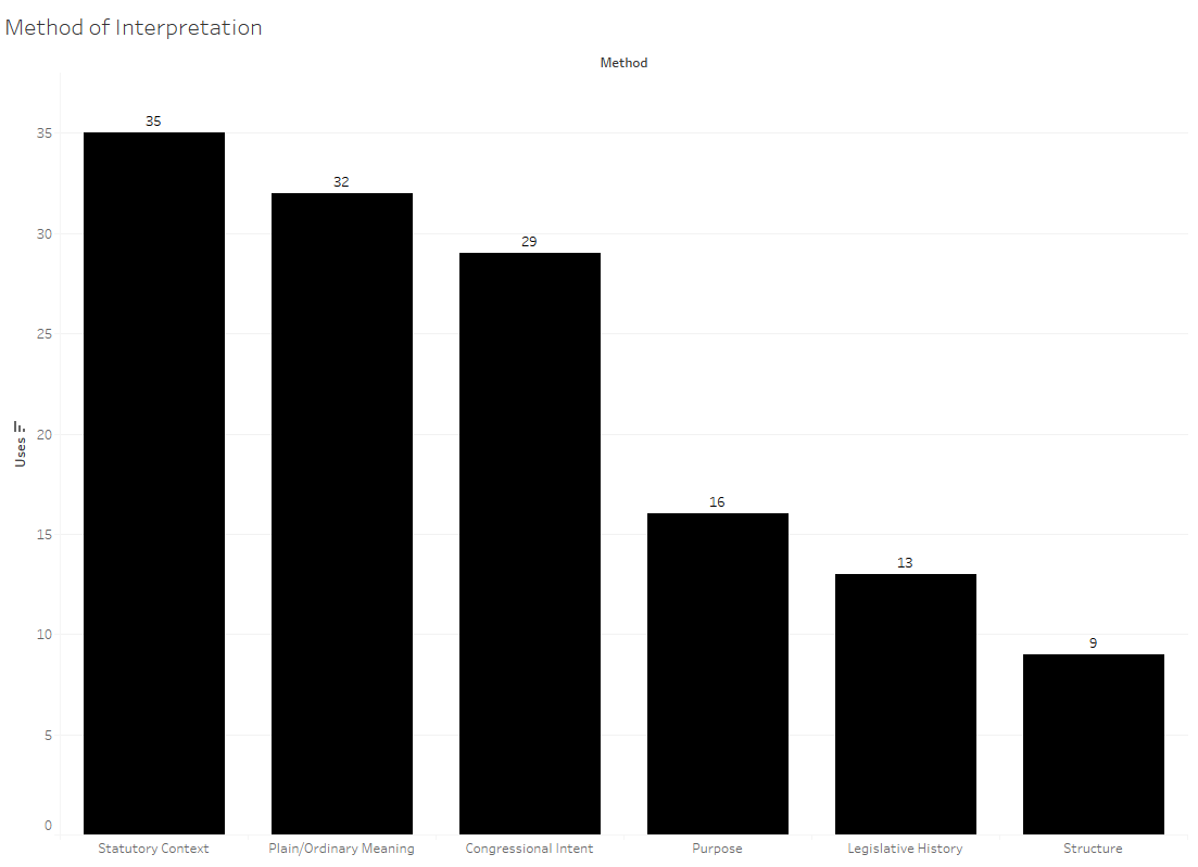 Within the cases, I focused on particular language referencing a method of interpretation as well as the number of times justices employed such methods. I excluded instances in which justices used a method of interpretation to rebut a point or say that someone else looked at a statute in such a fashion (e.g., in a lower-court opinion).