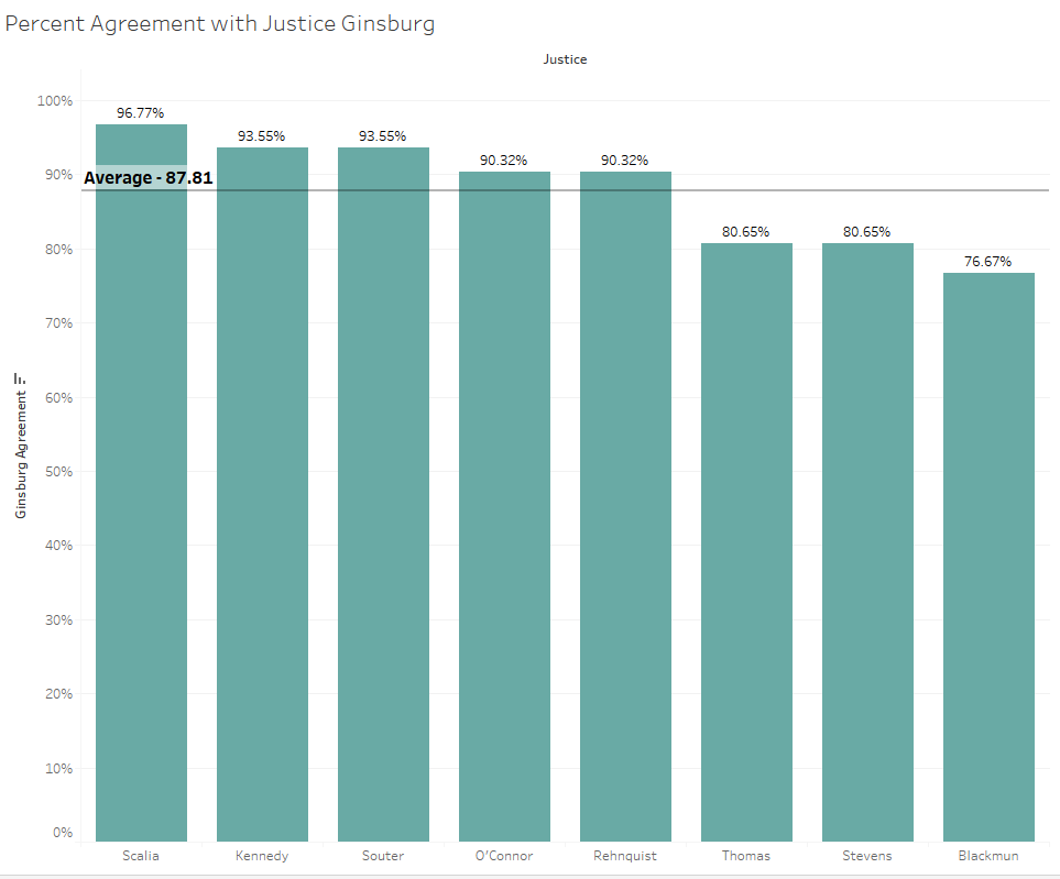 With an average of 87.81 percent agreement, Ginsburg had over 90 percent alignment with the more conservative Justice Sandra Day O’Connor and Rehnquist. Ginsburg had her lowest alignment with Blackmun, at 76.67 percent.