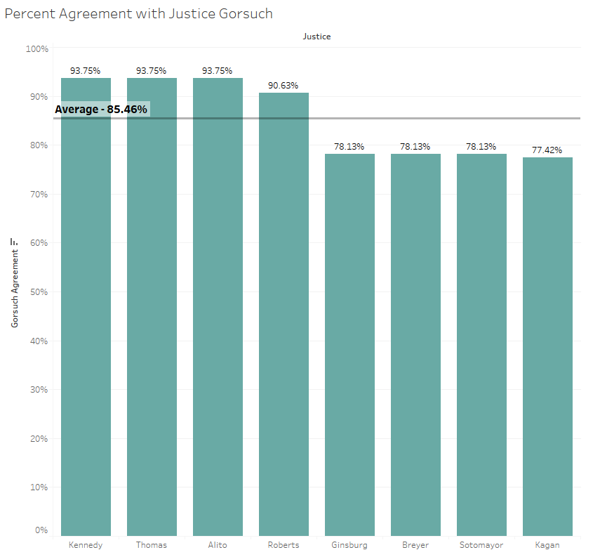 Through this set of decisions, Gorsuch voted the same way as Kennedy, Thomas and Justice Samuel Alito each 93.75 percent of the time. Gorsuch’s alignment with Chief Justice John Roberts is close behind, with an alignment of 90.63 percent, while none of the more liberal justices have above 80 percent agreement with Gorsuch. Gorsuch’s average agreement percentage of 85.46 percent is right in the middle of those for the other justices. Within the set of Gorsuch’s first 32 votes, he dissented six times, wrote four majority opinions and authored three dissents. Seventy-five percent of these decisions (24 of 32) were unanimous.