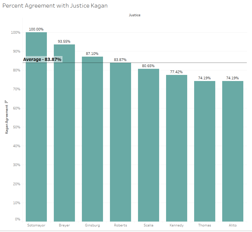 There is a clear distinction between Kagan’s alignment with the more liberal justices, who are all above her average alignment level, and with the conservative justices, who all fall at or below her average level of voting alignment.