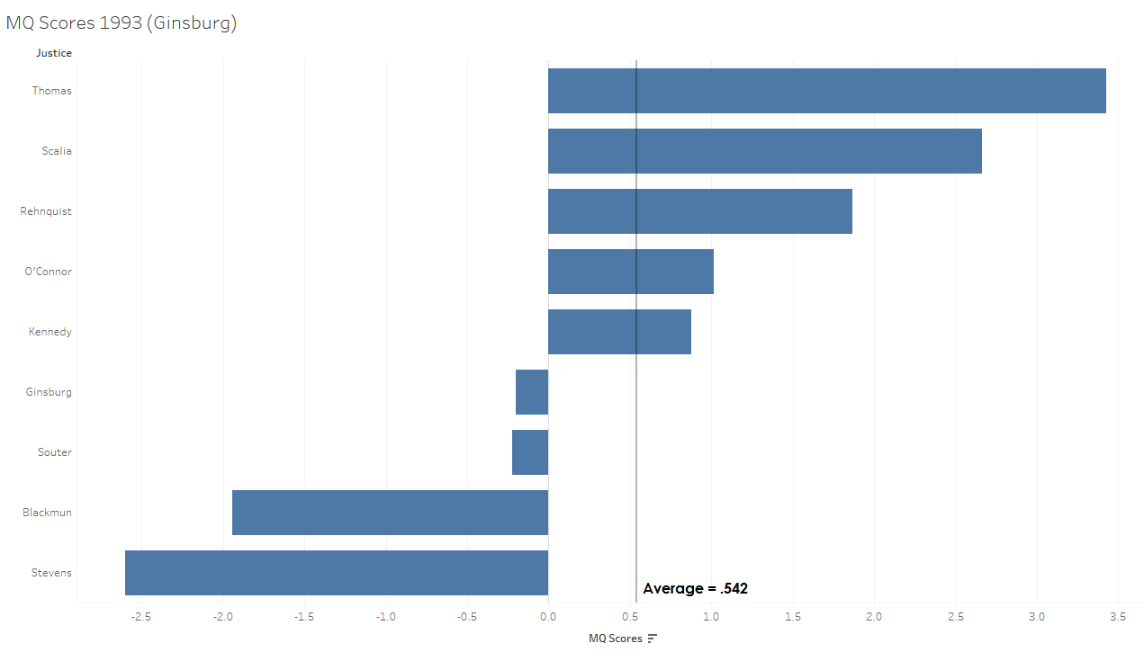 The court was still predominantly conservative when Ginsburg joined, and the average MQ Score was also in conservative territory.