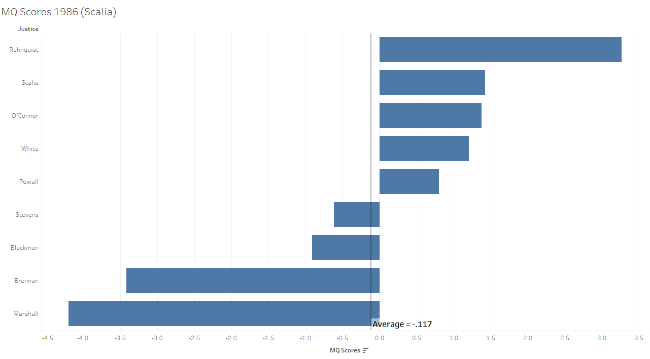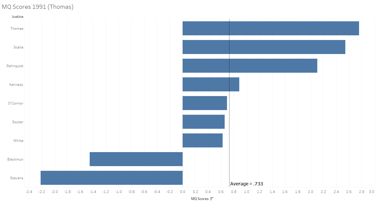 Only Justice John Paul Stevens and Blackmun were liberal holdouts at this point. The court’s average MQ Score at this time was well into conservative territory at .733. As the only one who was the most conservative justice in his first term on the court, Thomas is unique among the justices examined in this post.