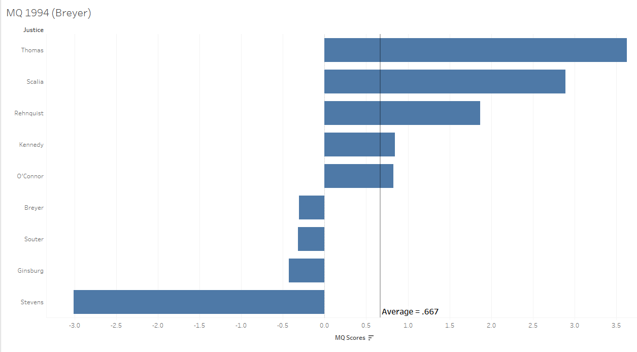 Justice Stephen Breyer joined the court the year after Ginsburg was confirmed. When Breyer joined, the ideological makeup of the court was predominantly conservative, as it had been the previous year, and so was the average MQ Score across justices.
