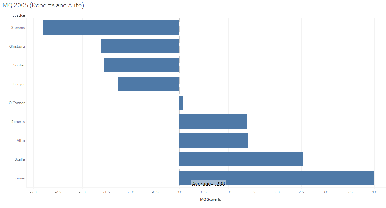 These justices’ MQ Scores at the end of the 2005 term were quite similar to one another and placed them as the third and fourth most conservative justices on the court. The court still had a 5-4 conservative balance at the time, although only slightly, because O’Connor had slipped to an almost neutral position by her final term in 2005.