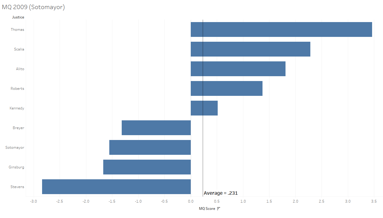 According to her MQ Score, Sotomayor was the third most liberal justice by the end of her first term – more liberal than Breyer, while less liberal than Ginsburg and Stevens.