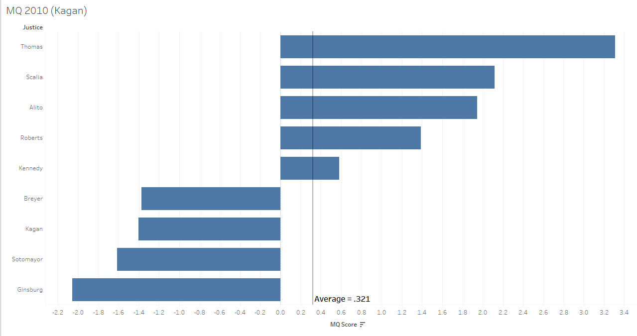 When Justice Elena Kagan joined the court, she became the fourth strong liberal vote. At this time, though, Kennedy still voted predominantly alongside the more conservative justices, and this helped prop up the average MQ Score for the 2010 term.