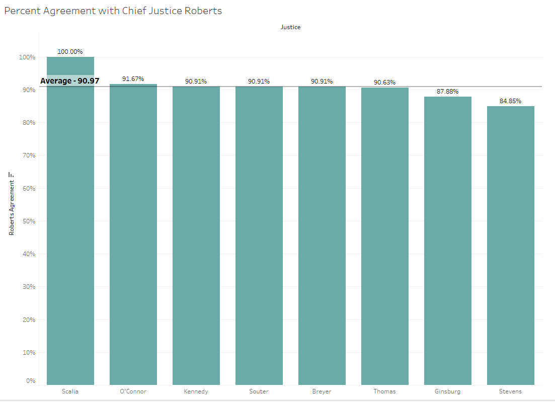 Surprisingly, Breyer’s lower average alignment score of 81.91 percent was brought down the most because of his lack of alignment with the most liberal member of that court, Stevens. Breyer’s alignment with Thomas was also on the low end, while he had a high degree of alignment with Ginsburg and Kennedy.