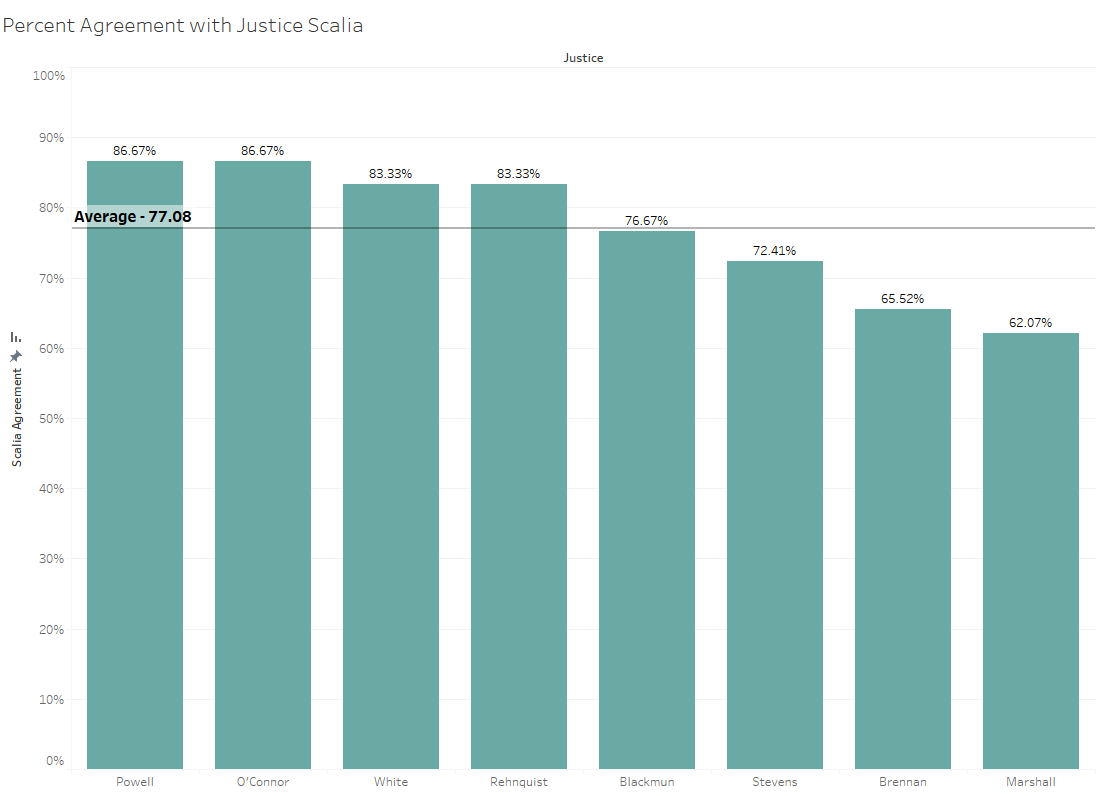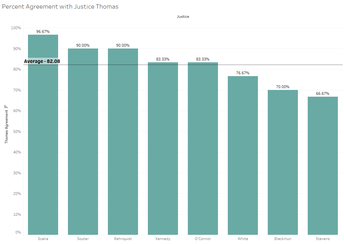 Thomas’ average agreement with the other justices was above that for Scalia, but below that for Kennedy.