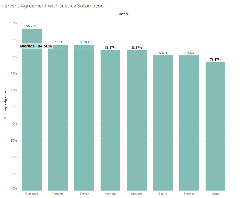 Aside from Sotomayor’s high alignment with Ginsburg, Sotomayor actually aligned next closely with the more conservative Roberts. Sotomayor shared the fewest number of votes with Alito.