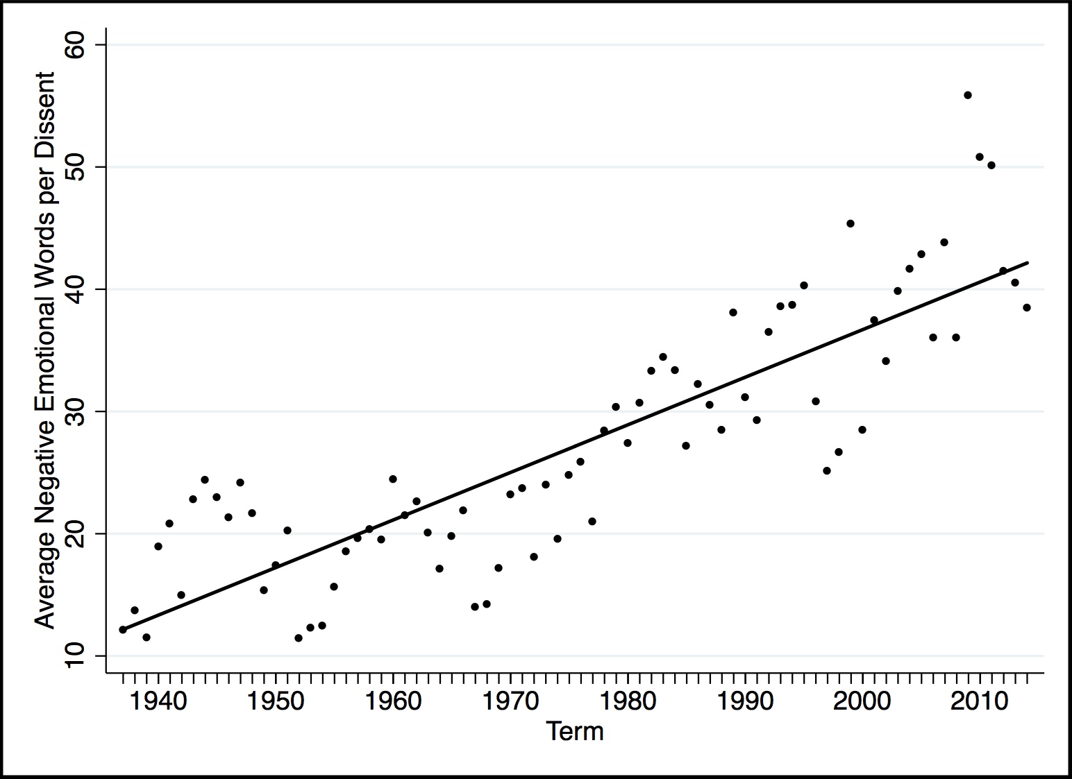 Hinkle, who has not been able to do extensive analysis on this new graph, told me that this increase in the usage of negative emotional words over time “is a bit of a puzzle.” One possibility might be that the total number of separate opinions is increasing over time. As a result, “justices may feel an increasing need to make their dissents stand out.” It’s also “conceivable that justices have long realized that negative emotional language is a way to catch attention and that the observed pattern is the result of a sort of ‘arms race’ in which justices realize they have to keep using more and more negative emotional language in order to garner readers’ attention.”
