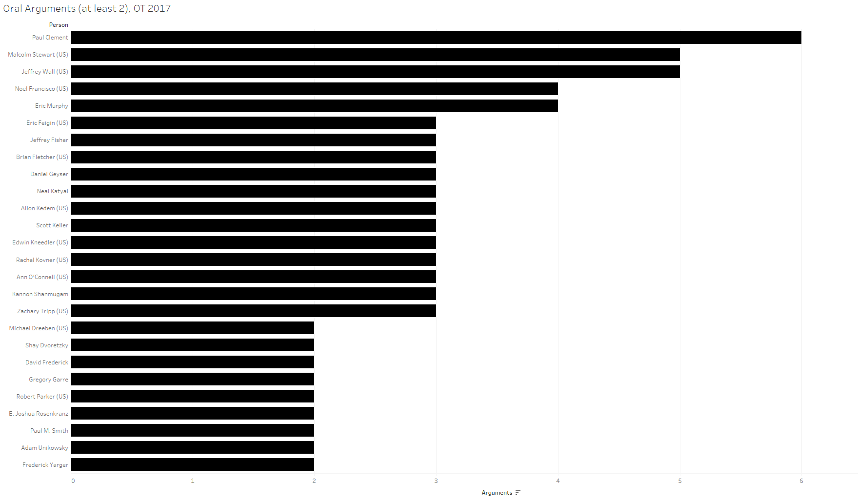 Paul Clement was the leading oral advocate before the court this term with six appearances, covering almost 10 percent of this term’s argued cases. His count surpasses even those of Office of the Solicitor General attorneys Noel Francisco, Jeffrey Wall and Michael Dreeben. Ohio’s solicitor general, Eric Murphy, argued four cases. He did not argue in the Supreme Court last term. Along with OSG attorneys and Supreme Court regulars Jeffrey Fisher and Neal Katyal, Stris & Maher’s Daniel Geyser and Texas Solicitor General Scott Keller had three arguments apiece. Geyser’s presence is especially notable because it highlights the increasing profile of this boutique appellate firm before the court (Stris & Maher is not new to the court, however, as named partner Peter Stris mainly handled the firm’s Supreme Court litigation in the past.).