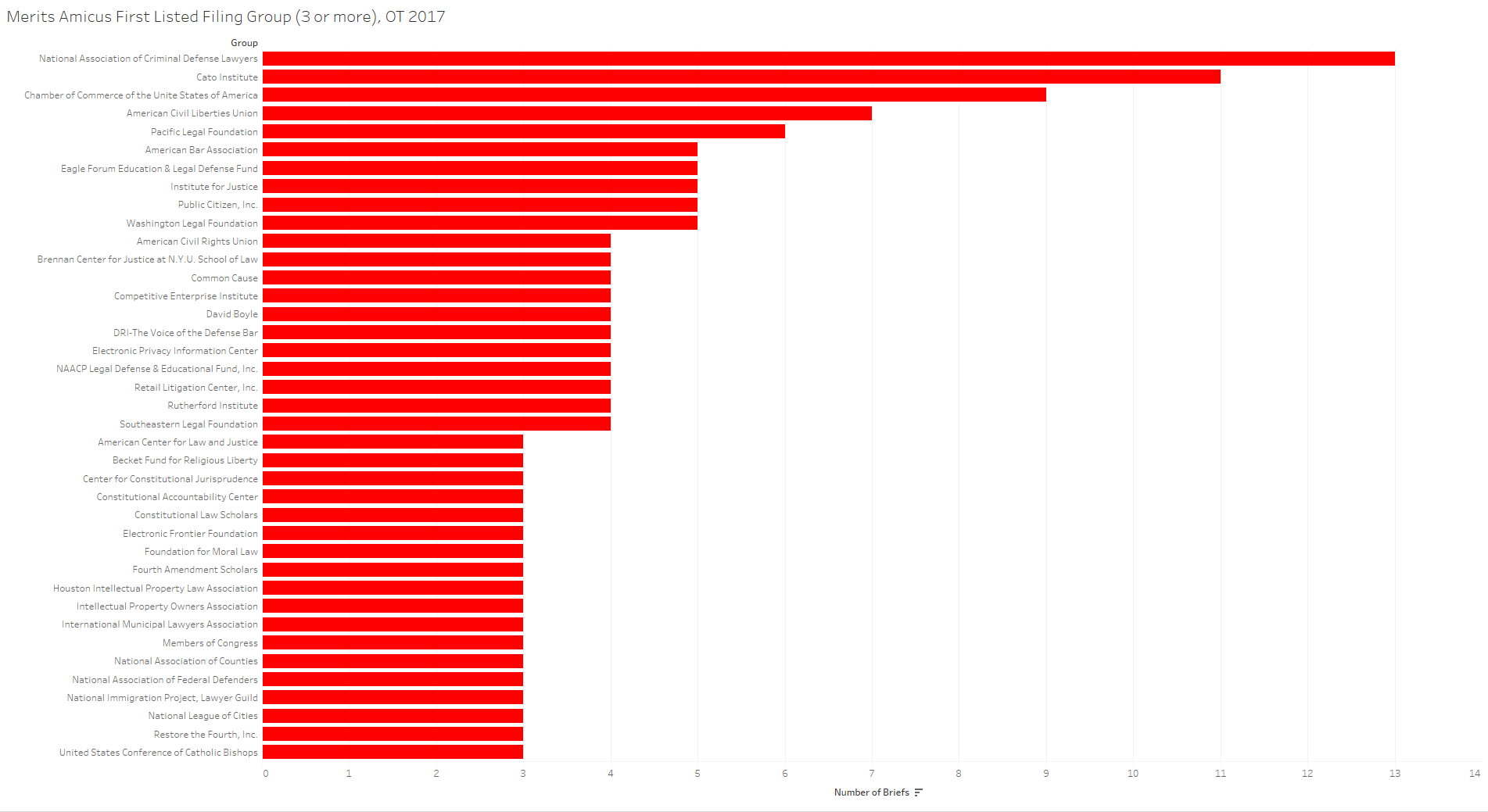 One of the most prolific amicus filers over recent years, the National Association of Criminal Defense Lawyers tops the list of groups, with 13 briefs as the first named group. The Cato Institute and the Chamber of Commerce, two top filers for the past several years, filed the second and third most amicus briefs, with the ACLU and Pacific Legal rounding out the top five. The ACLU and Pacific Legal also participated in three and two cases on the merits respectively.
