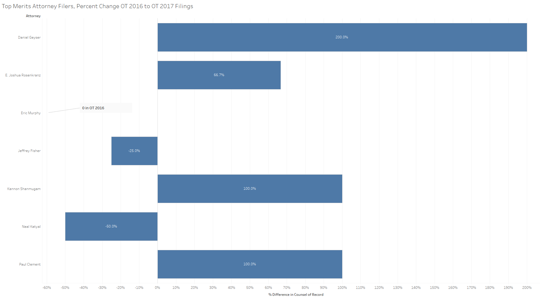 Daniel Geyser had the largest jump this year, increasing 200 percent as he moved from one case as counsel of record last term to three this term. Shanmugam and Clement both doubled their counts from last term, with six and four cases as counsel of record respectively. Rosenkranz went from three cases last term to five this term. On the other end of the spectrum, Katyal moved from six cases last term to three this term and Fisher went from four cases last term to three this term.