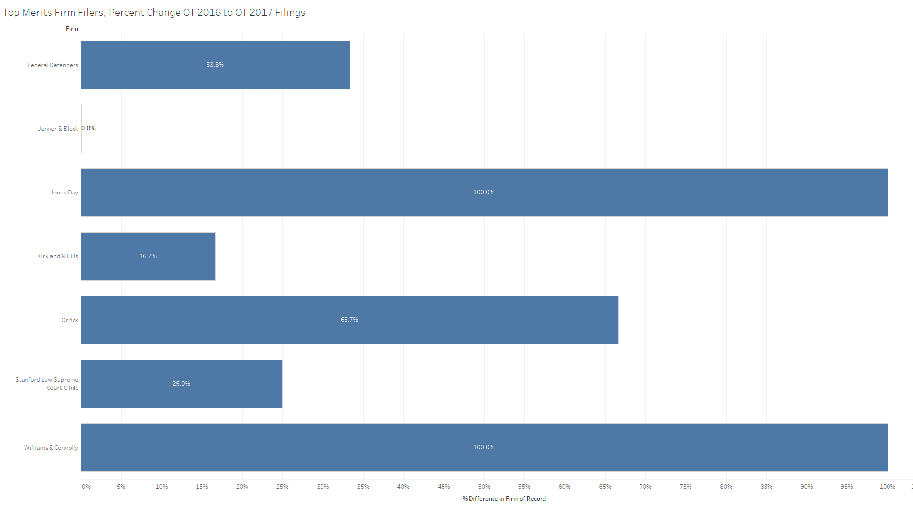 Jones Day and Williams & Connolly made the largest jumps this term, moving from two cases last term to four this term. With Paul Clement’s increased participation this term, Kirkland & Ellis also saw a jump in cases, as did Orrick and Stanford’s Supreme Court Litigation Clinic.