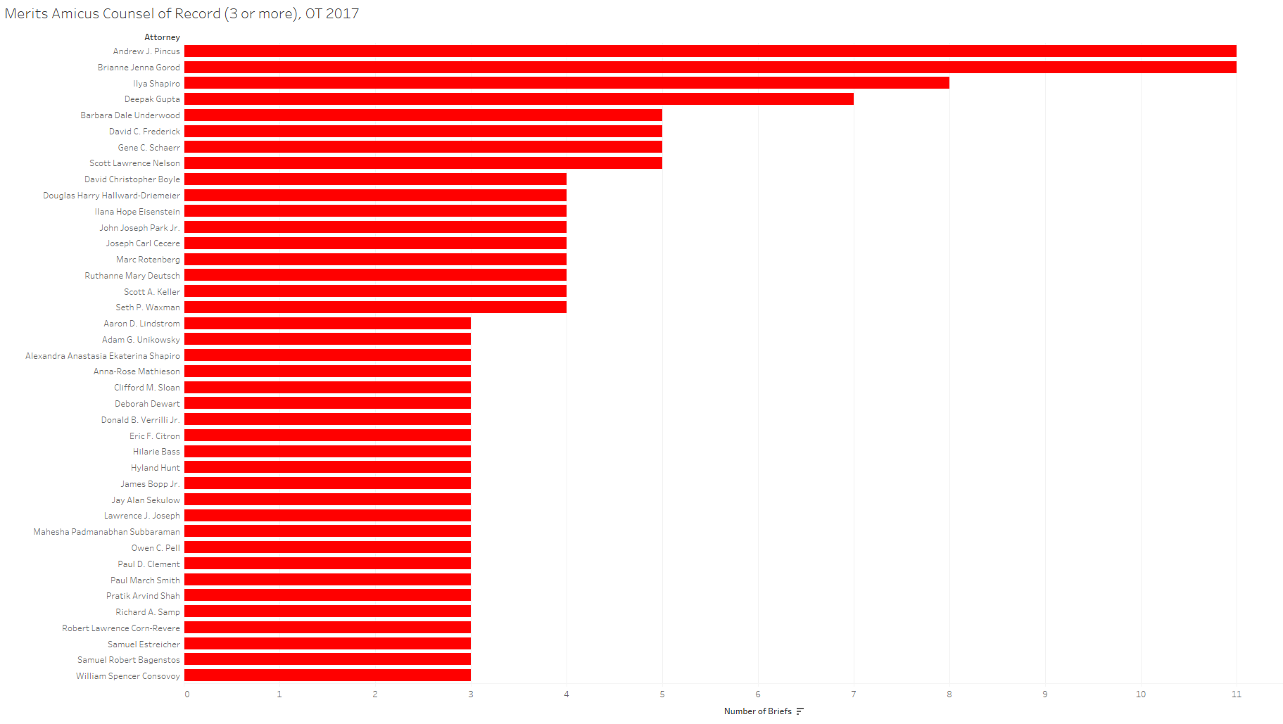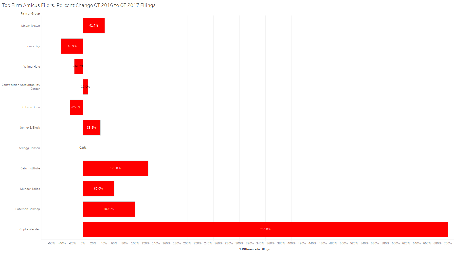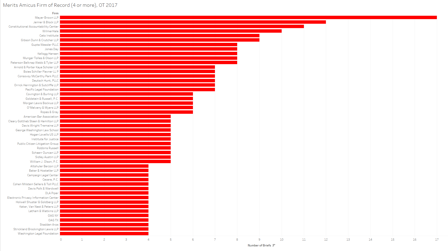 As with attorneys of record on amicus briefs, the biggest jump for firms was Deepak Gupta’s firm Gupta Wessler. Other large jumps include that of the Cato Institute, which moved from four briefs last term to nine this term, and Patterson Belknap, which moved from four briefs last term to eight this term. After a huge term in 2016, Jones Day saw a decline in amicus filings this term, going from 14 in 2016 to eight in 2017.