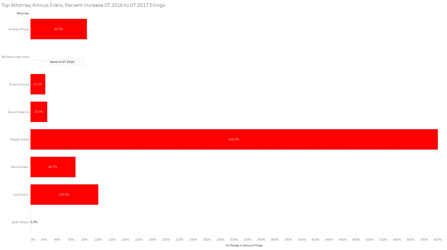 Gupta jumped from one amicus filing last term to seven this term. Barbara Underwood on behalf of New York state moved from zero amicus filings last term to five this term. The other attorneys on this list had more moderate but nonetheless noteworthy increases, including Shapiro, who went from four briefs last term to eight this term, and Pincus, who went from six last term to 11 this term.