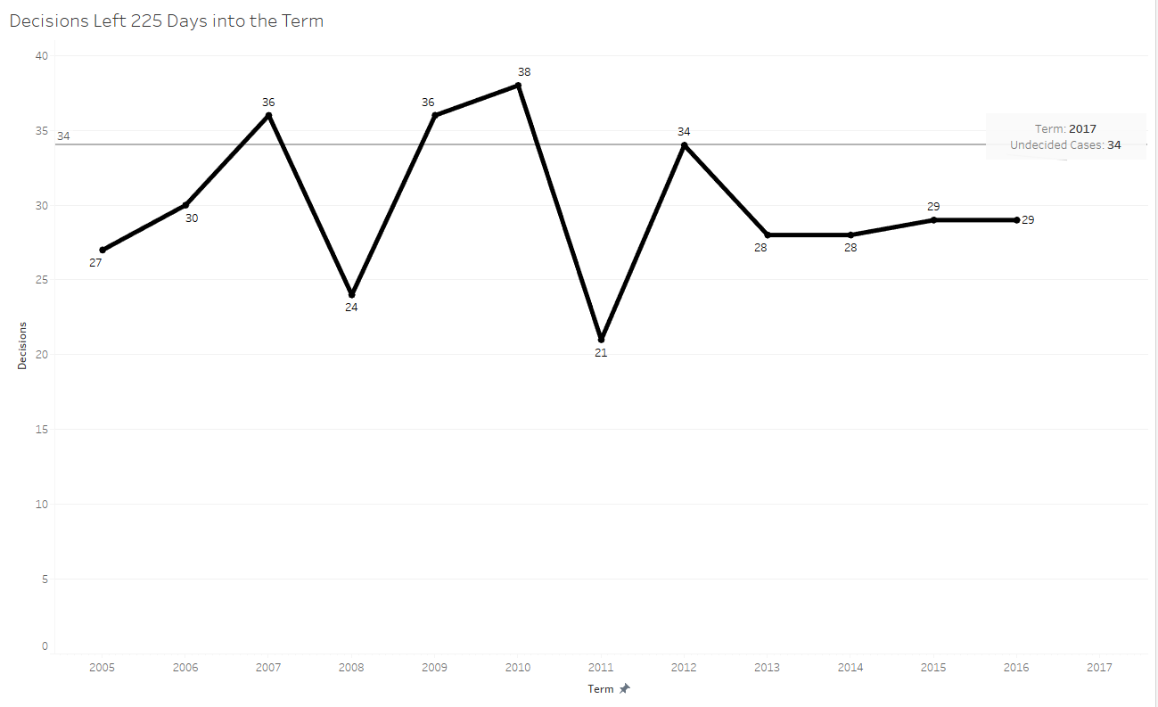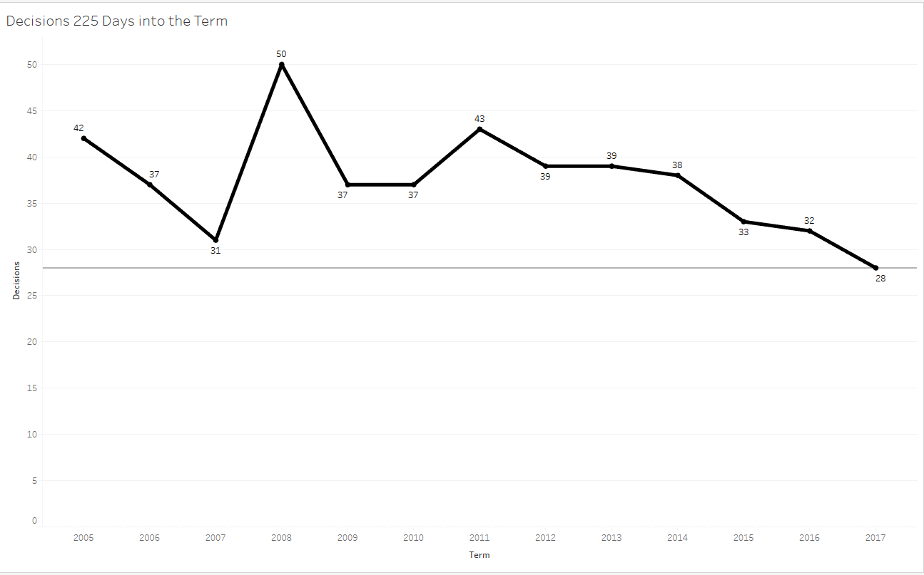 The Supreme Court’s previous low count for opinion output after 225 days was in 2007, with 31 opinions.