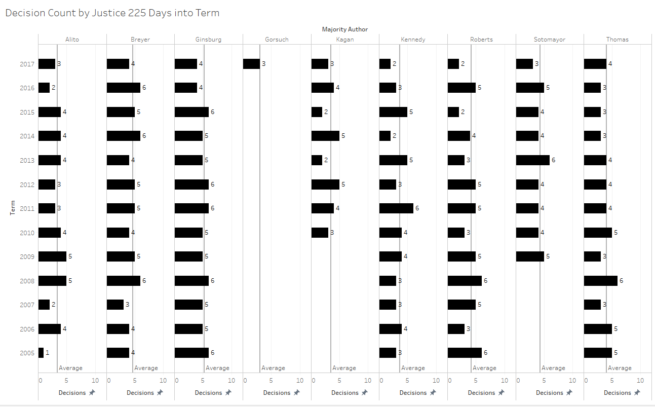When we look at output per justice 225 days into the Supreme Court term, all justices are at or below their average output rate this far into a term under Roberts.