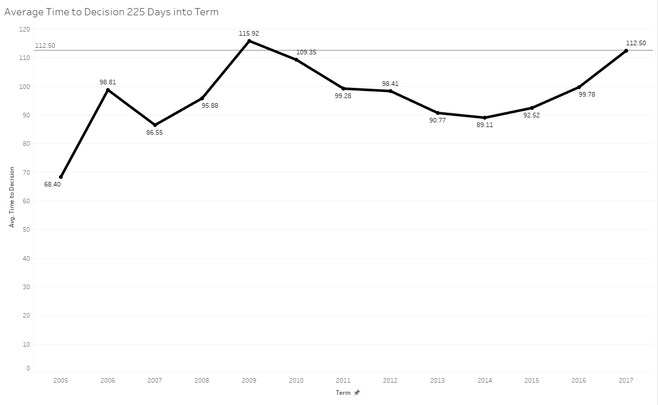 Yesterday marked the 225th day of the 2017 Supreme Court term. The court compensated for a slow term so far with five new decisions. Even with these rulings — Murphy v. NCAA, Dahda v. United States, Byrd v. United States, United States v. Sanchez-Gomez and McCoy v. Louisiana — the court is still behind its output every other year under Chief Justice John Roberts. Counting the output from days since the first oral argument of the term seems the most appropriate way to normalize the court’s output rate across terms. This figure shows where the court stands now in terms of decision output and how this compares to all of the terms since 2005.