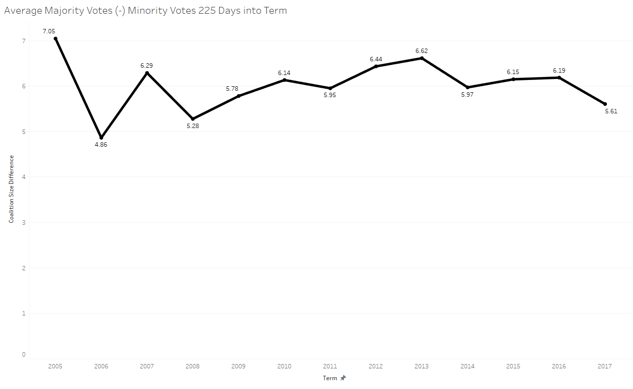 The Roberts court has twice had lower average coalition difference sizes 225 days into the term. Although the court is still on the low end for this aspect of voting, it is not looking to set records in this respect.
