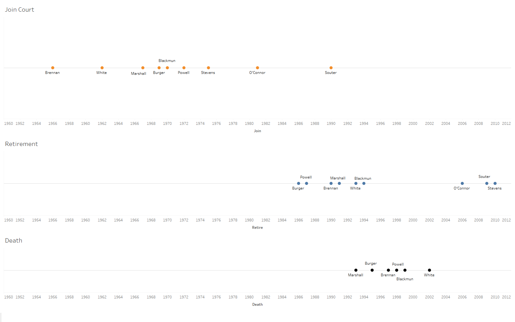 To probe a bit deeper, how better to get a sense of the likelihood that Kennedy will depart than by looking at previous retirees? Nine justices retired between and including Chief Justice Warren Burger in 1986 and the most recent retirement of Stevens in 2010. The figure below looks at three timelines that track when these nine justices joined the court, retired, and, where relevant, passed away.