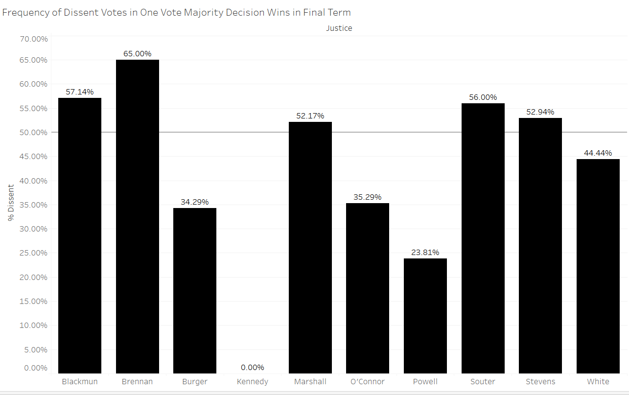 As with much of the data on the retirees, there is a clear distinction between liberal and conservative justices. Because conservatives have been in the majority on the Supreme Court since the early Burger court, all of the justices examined in this post retired from a court with a conservative majority. The liberal-voting justices in the figure above dissented more than 50 percent of the time in cases decided by one vote in their final terms, while the more conservative justices are all below the 50-percent line. Kennedy’s zero percentage reflects that he did not dissent in a case decided by a one-vote margin in the 2016 term, the last complete term available for this analysis. However, he has already dissented in two such cases during the 2017 term – Sessions v. Dimaya and Artis v. District of Columbia.