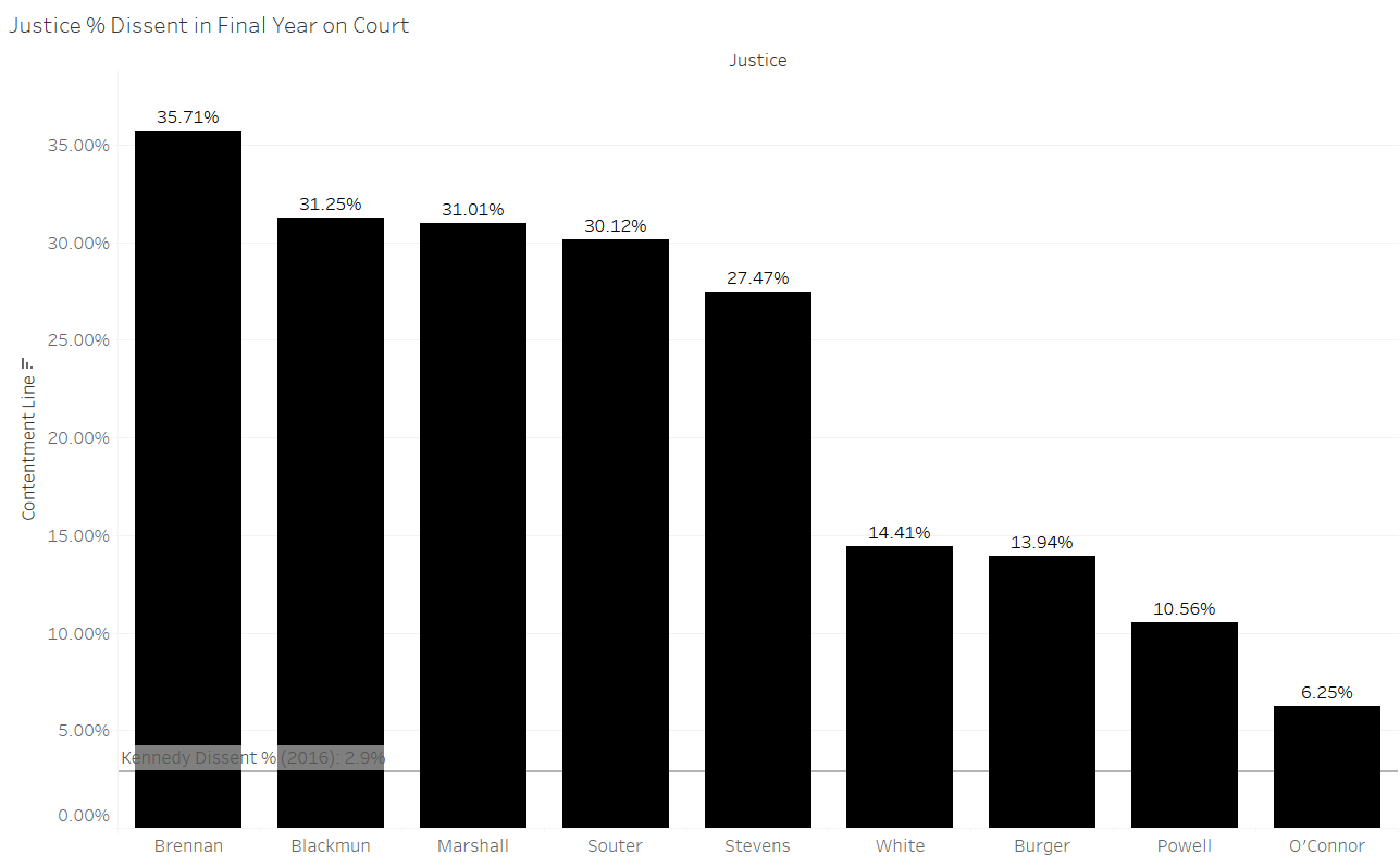 According to individual disagreement measures, Kennedy should be quite satisfied with his place on the Supreme Court. The measures that convey this are his dissents in cases decided by one vote and his dissenting frequency last term. (The last term prior to retirement is used for all other justices.)