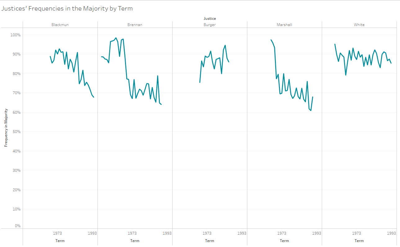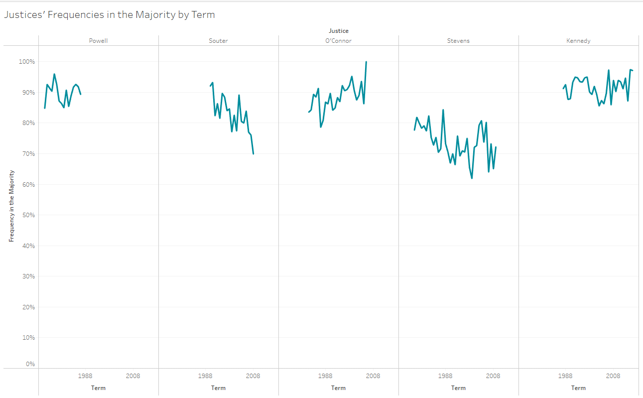 Kennedy’s frequency in the majority has hovered at about the 90 percent level across his career on the Supreme Court. The more liberal justices’ frequencies tend to fall well below this marker, while the more conservative justices are all in a similar range.