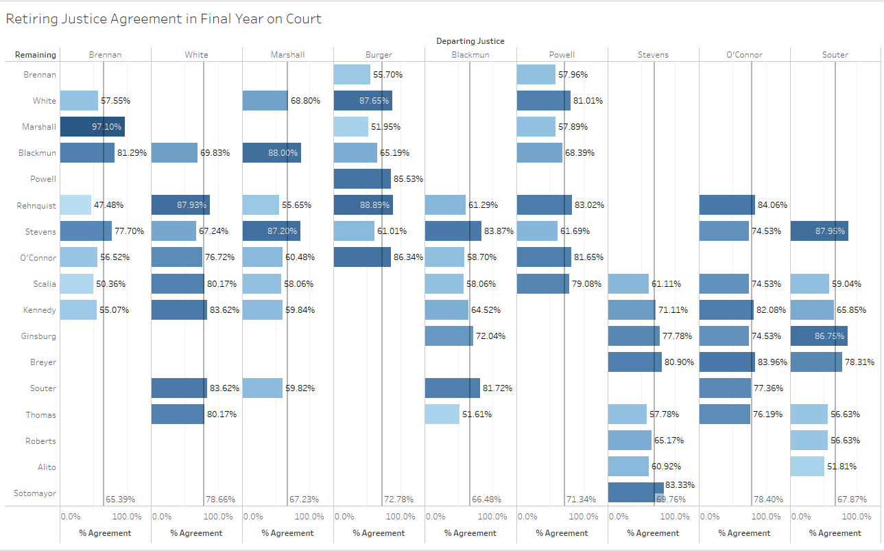 Looking at the retiring justices’ agreement levels with the other justices on the court in their final terms shows a similar distinction between more and less contented justices. Note that the darker bars in the figure below correspond with higher agreement levels and the gray lines are the retiring justices’ average agreement levels for the term.