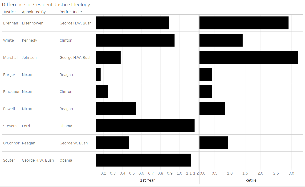Most justices in the figure above retired with low relative absolute differences in ideology scores. Justice Thurgood Marshall, who had the highest difference in score upon his retirement, was already in declining health when he left the court and was primarily a member of the court’s dissenting coalitions at that time. Even though Stevens and Justice David Souter do not have available scores for the years of their retirements, both tended to vote on the liberal end of the spectrum and retired under President Barack Obama, and so neither would likely have had a great absolute difference in ideology from the president upon their retirements.