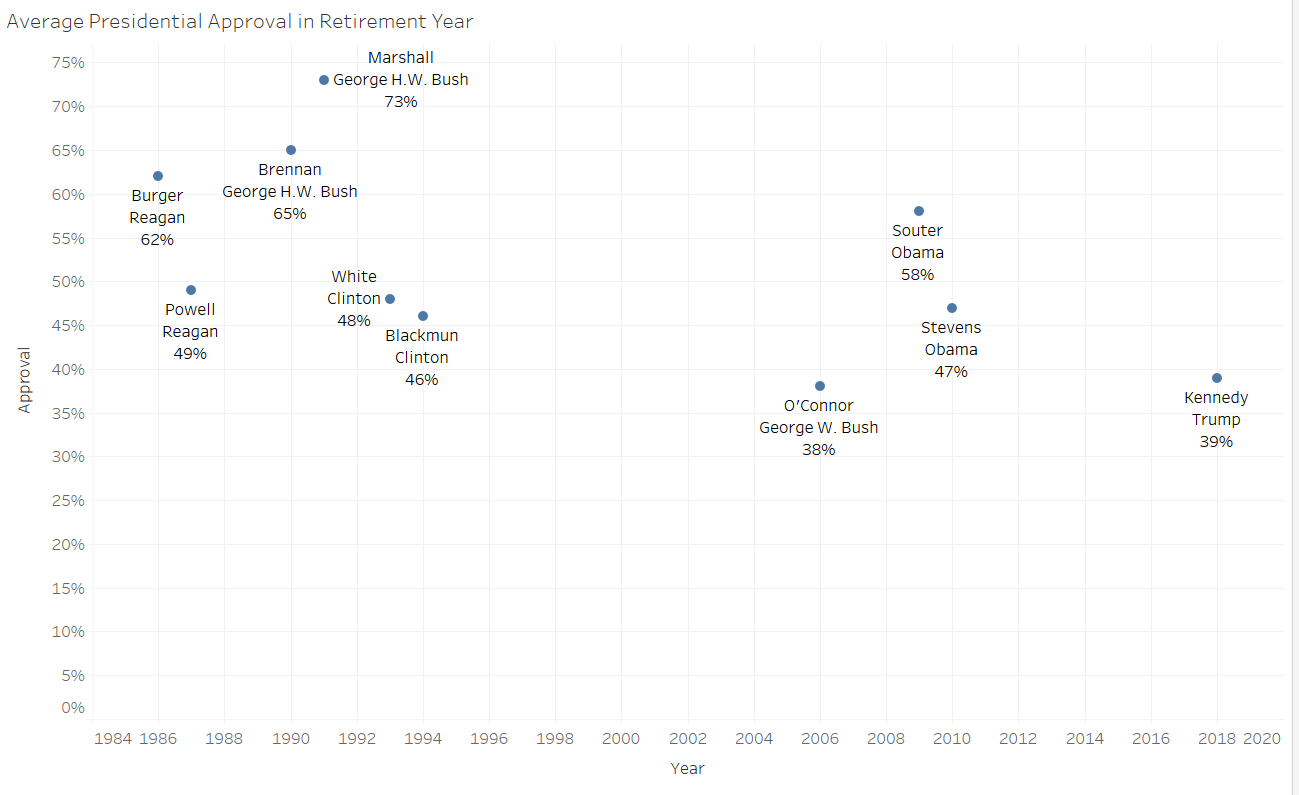 If Kennedy were to retire right now, he would retire under the second-lowest average presidential approval level for the justices measured in this post. Only President George W. Bush’s approval rating in 2006 was lower. The rest of the justices retired under presidents with at least a 40-percent average approval rating in the justice’s final year, suggesting a potential albeit tenuous relationship that may factor into a justice’s calculus.