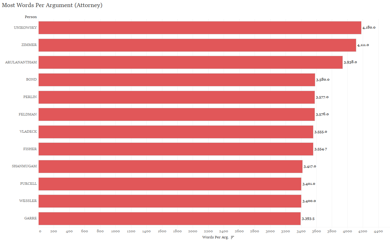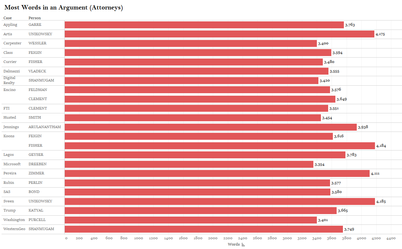 Examining the participation of attorneys in a bit more detail, we can gather more information about their involvement at the case level. Below are the attorneys who spoke the most words per argument.
