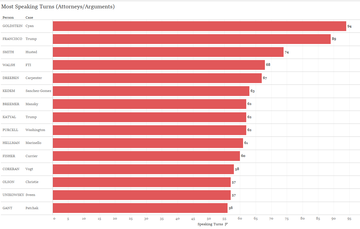 Although these attorneys were able to articulate a lot of substance during oral arguments, they did not all have equal opportunities to do so. Some made the most of fewer opportunities, while others provided curt responses across many turns talking. The breakdown of attorneys with the most speaking turns by argument is shown next.