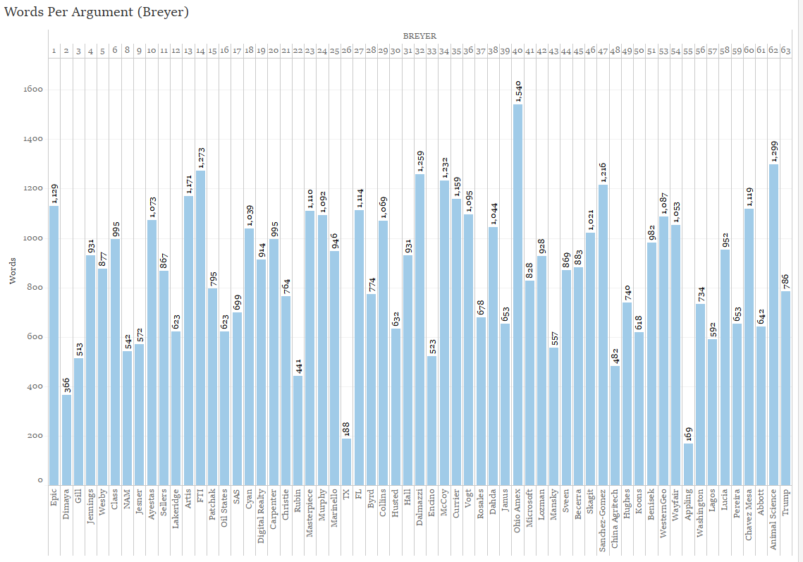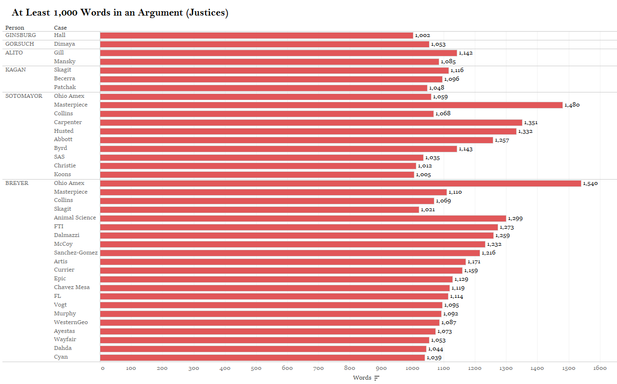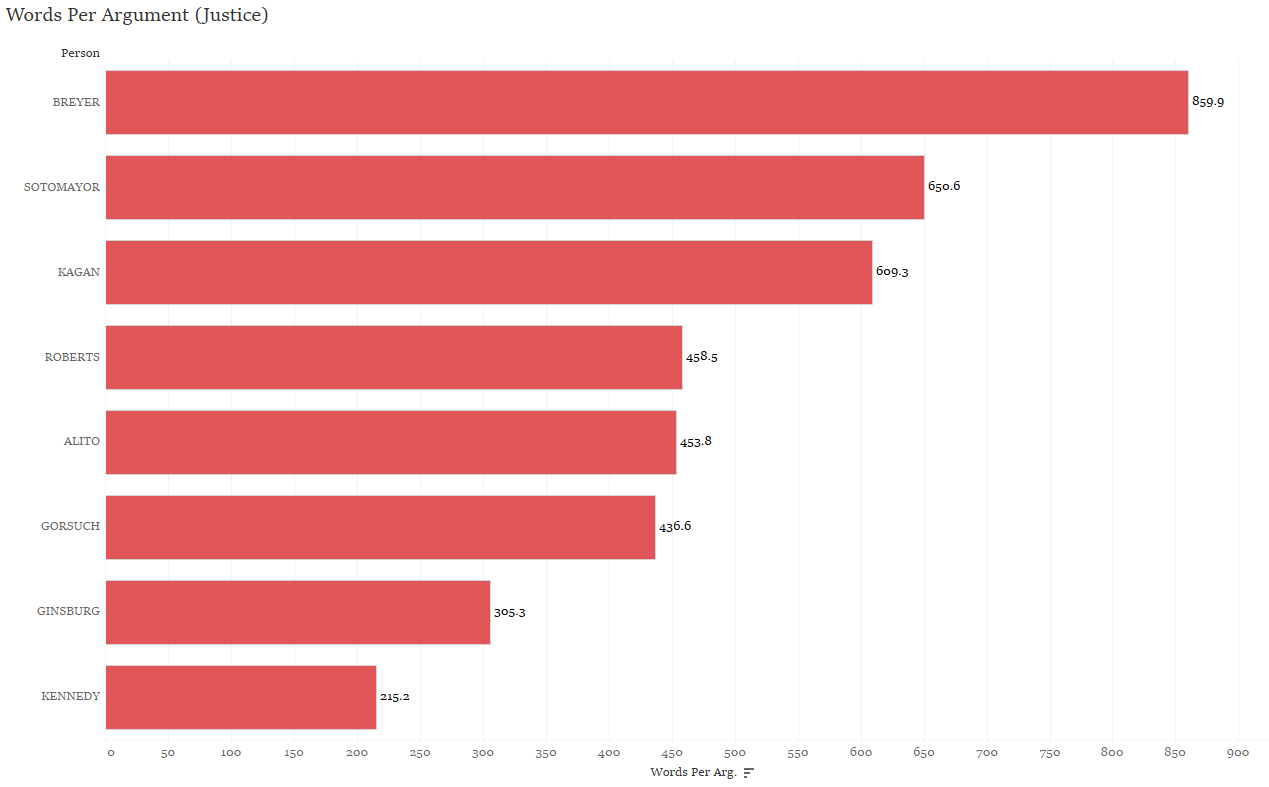 Breyer alone had more arguments with at least 1,000 words than the rest of the justices combined. He also had the most words in an argument this term in the Ohio v. American Express case. Sotomayor had the second most words in an argument in Masterpiece Cakeshop.