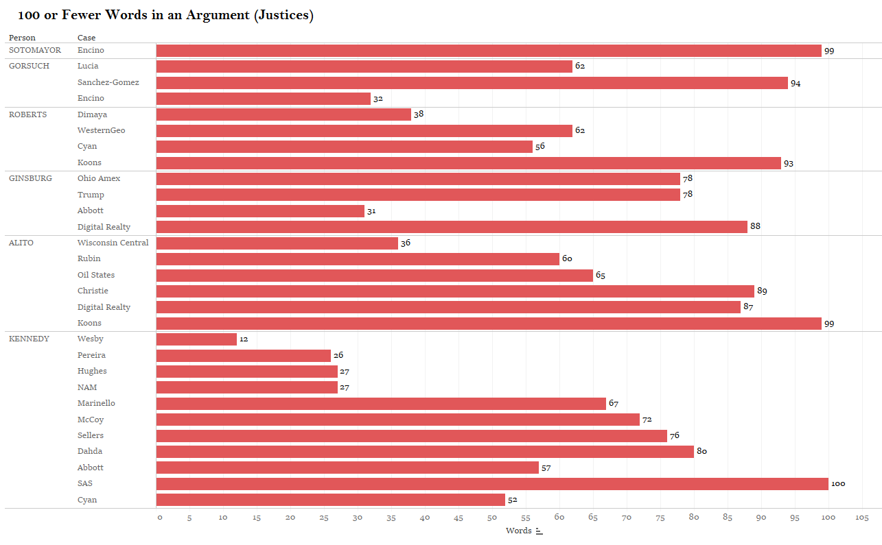 Not surprisingly given his low output across the entire term, Kennedy had the most such instances among the justices. Still, five other justices are also covered in this figure, and the only justice in this figure with just one instance of 100 words or fewer in an argument is Sotomayor. This goes to show that the justices (possibly with the exception of Breyer) put a disparate amount of energy into various oral arguments, and that Kennedy deliberately chooses when to engage.