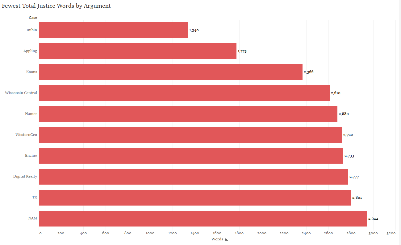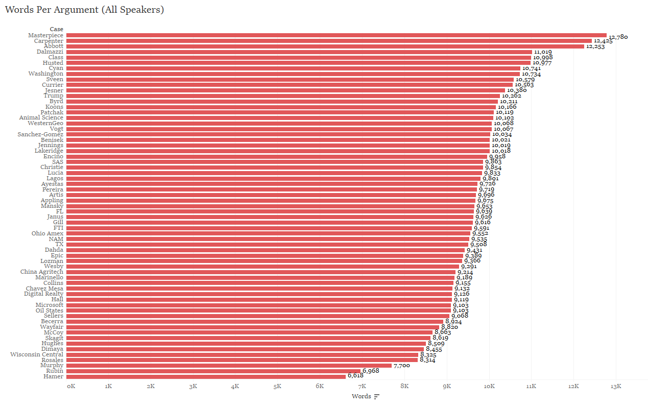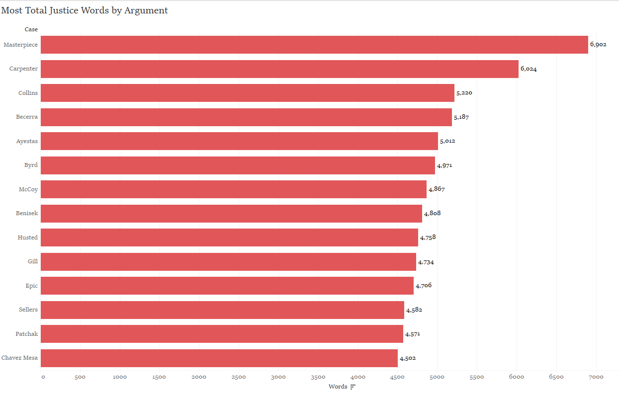While at only the normal allotted time of one hour, the number of words spoken was at the high end in the Masterpiece Cakeshop and Carpenter v. United States cases, while it was minimized in cases at the opposite end of the spectrum like Hamer v. Neighborhood Housing Services of Chicago and Rubin.