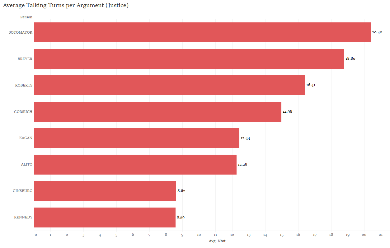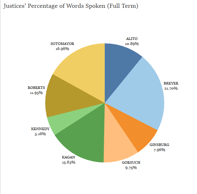 Sotomayor usurps the speaker role more than any of the other justices. Breyer takes the second most talking turns of the justices and yet speaks volumes more than any of the other justices. The justices aside from Thomas who speak the least — Ginsburg and Kennedy – also take the fewest speaking turns.