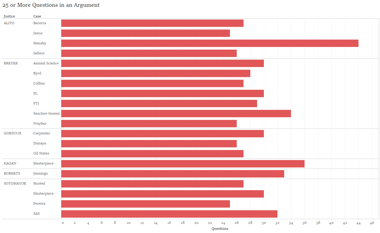 The justices use their speaking opportunities differently. Some choose to ask more questions than others. (I use question marks as the marker for questions in this analysis.) The instances when justices asked 25 or more questions in an argument this term are shown in the next figure.