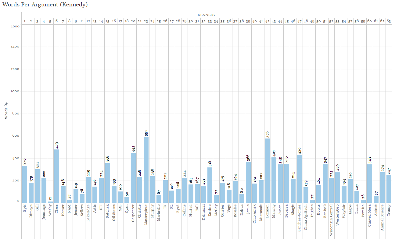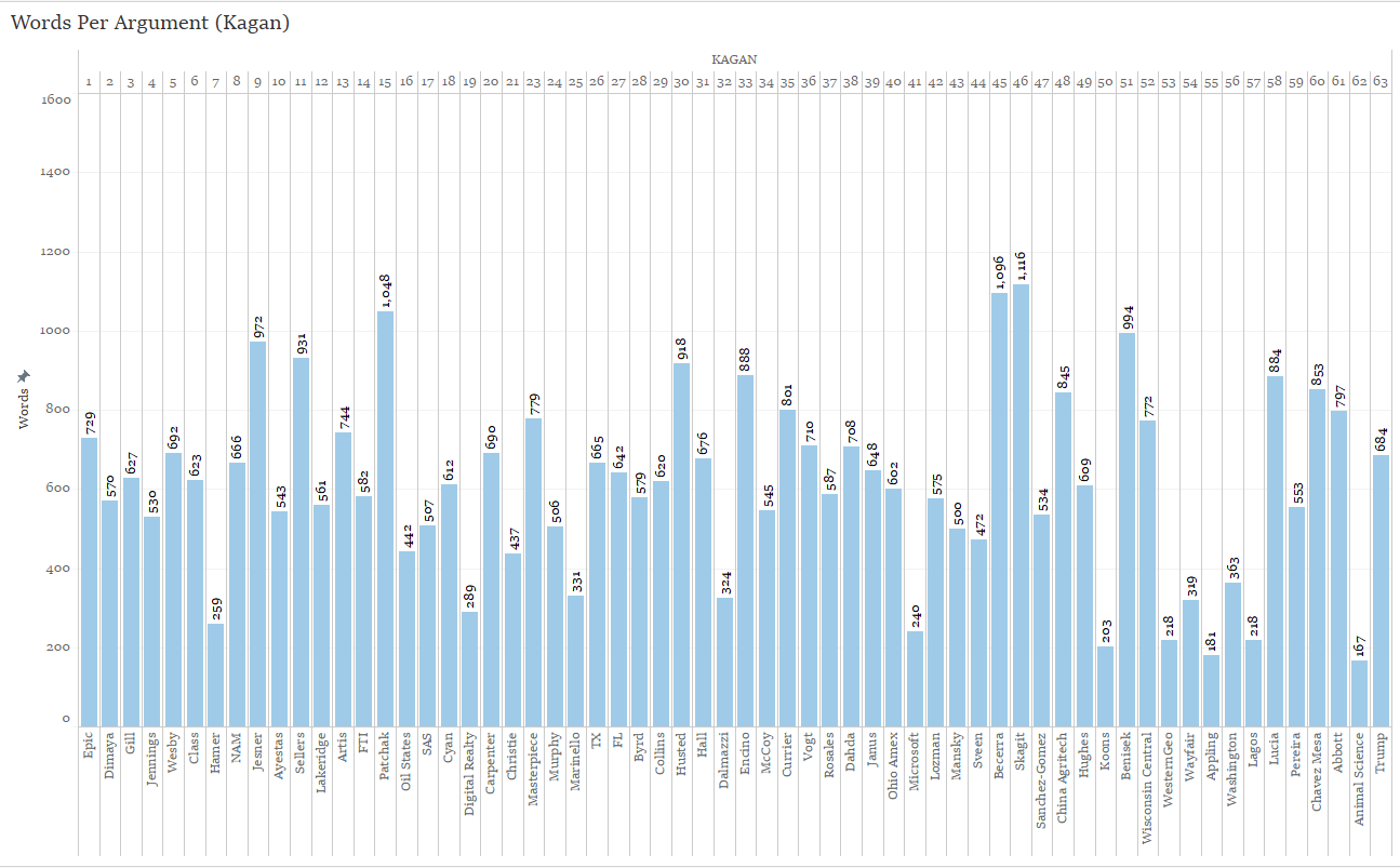 Kagan had multiple arguments with over 1,000 words, including in Upper Skagit Indian Tribe v. Lundgren, in which she had a word count of 1,116. Even when Kagan spoke less, she had over 100 words per argument, so she was more active on a regular basis than Ginsburg or Kennedy.